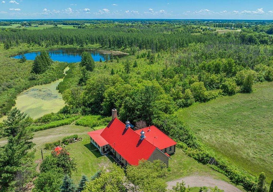 This stunning historic home, just 6 miles from Interstate 35, sits on a breathtaking 43-acre estate featuring 40 acres of pristine natural wetlands and a 10-acre spring-fed pond alive with wildlife. Originally the local creamery, the residence has been masterfully transformed by a skilled craftsman, blending timeless historic charm with stylish modern updates. Inside, soaring 16-foot ceilings in the main living area create an open, inviting atmosphere perfect for hosting large gatherings—imagine fitting the biggest Christmas tree with ease! The expansive three-season porch extends your entertaining options or offers a peaceful spot to relax while enjoying scenic views.