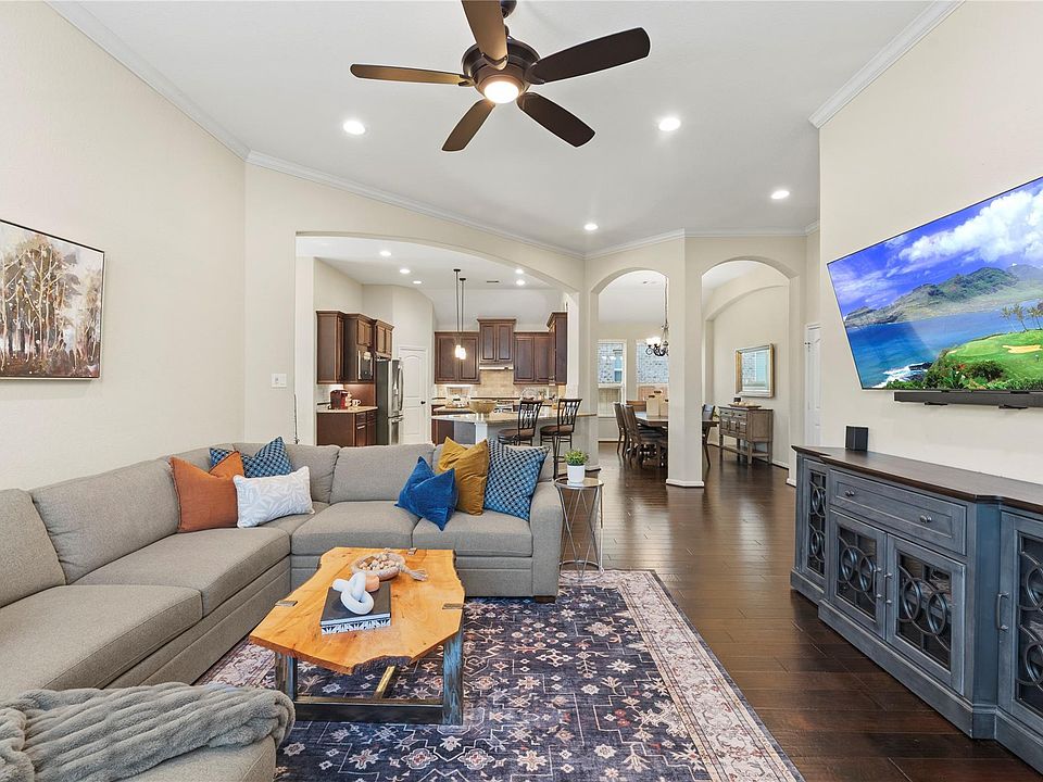 Embrace luxury living in this stunning Towne Lake home! Featuring 3 bedrooms, 2 baths, a private study (or 4th bedroom), and a cozy stone fireplace for movie nights. The open floor plan showcases hardwood floors, crown molding, and ample natural light. The kitchen is a chef's dream with granite countertops, stainless steel appliances, and a charming island. Enjoy the covered patio for morning coffee or margaritas. New A/C (2020) and new gutters (2024) add to the appeal. Walk to the school and indulge in Towne Lake's amenities like a 300-acre lake, fitness centers, splash pads, and more. Your dream home awaits!