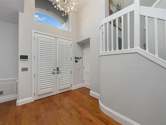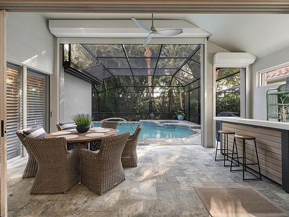 This beautifully updated home sits in the sought-after Ventura community within Pelican Marsh. The Spinnaker floor plan offers comfortable everyday living with a bright great room, formal dining area, and a welcoming breakfast nook. Wood flooring flows through the main living spaces, while the bedrooms offer soft carpeting and the baths feature thoughtful tile finishes. High ceilings and plantation shutters add to the open, airy feel of the home. The stunning kitchen offers quartz counters, tile backsplash, attractive cabinetry with select glass front accents, stainless steel appliances and updated lighting. The second floor features a loft and private guest suite with full bath, creating an ideal retreat for visitors. Both bathrooms have been fully redesigned with stylish finishes. A spacious screened lanai offers a private, peaceful setting surrounded by mature trees. Enjoy a sparkling pool and spa, a covered sitting area and plenty of room for lounging and dining. Additional enhancements include a newer roof, AC system with updated duct work, split AC in the garage, epoxy garage flooring and outdoor lighting that highlights the exterior in the evening. Storm preparation is effortless with newer electric hurricane shutters. Pelican Marsh is known for its lush landscape, nature preserves and convenient location near beaches, shopping, dining, arts and Naples attractions. Optional golf and social memberships are available through the Pelican Marsh Golf Club.