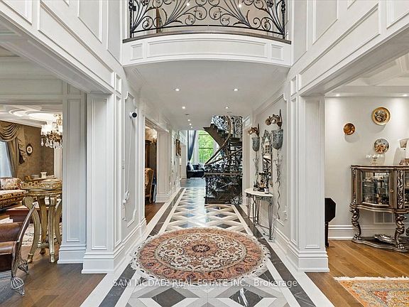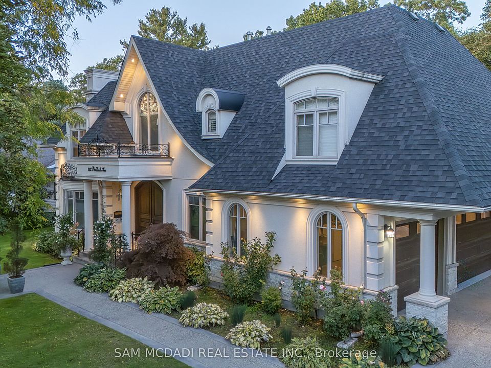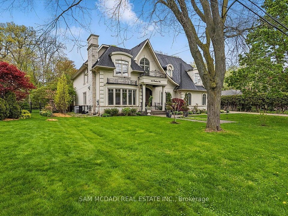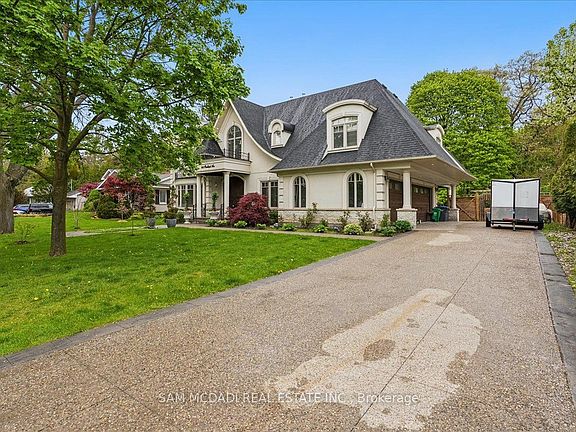 Surrounded by nature and prestige, this remarkable residence sits steps away from Rattray Marsh trails, Lake Ontario, and beloved local gems like Jack Darling Park and Meadow Wood Park. Perfectly situated on a sprawling 90x166 ft lot, this custom-built home backs onto lush green-space. Meticulously designed with over 7,000 sq ft of finished living space, this 4+2 bedroom, 7-bathroom estate captivates from the moment you arrive. A soaring 23-foot cathedral ceiling sets a striking tone, anchored by a solid wood staircase and drenched in natural light from floor-to-ceiling windows. Principal rooms flow with intention, from the living and great room to a spacious family room and dining, each detailed with rich hardwood, layered millwork, and timeless finishes. At the heart of the home lies a chef's kitchen outfitted with top-tier stainless steel appliances, custom cabinetry, a generous island, and a full pantry, ideal for entertaining. Premium features continue throughout: heated floors, built-in speakers, tray ceilings, multiple fireplaces and a private elevator connecting every level. On the upper level, the primary suite is a true retreat, featuring elegant coffered ceilings, a boutique-inspired dressing room, a spa-style ensuite, and a private walk-out balcony with serene backyard views. Each additional bedroom is designed with comfort and privacy in mind, offering custom closets and ensuite access. The finished walk-out lower level expands the living space, offering two more bedrooms, two full bathrooms, a den, and a generous recreation space. Outside, mature trees frame a private backyard sanctuary, offering rare tranquility. Whether you're enjoying morning coffee on the terrace or taking an evening stroll to the lake, this home delivers a lifestyle thats as elevated as its design.