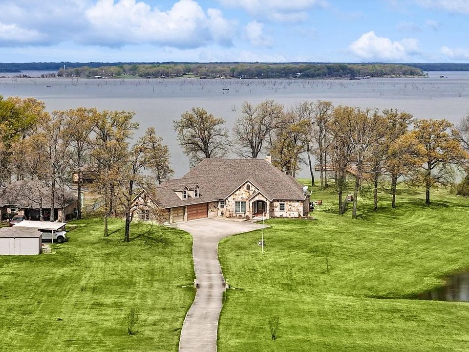 Welcome to your picturesque retreat on the shores of Lake Fork! This stunning lake house seamlessly blends luxury with the tranquility of lakeside living. Nestled on a spacious lot with over 235 feet of shoreline. Step inside and be greeted by the inviting open floor plan, where the living, dining, and kitchen areas effortlessly flow together, creating a perfect space for gatherings and entertaining. Large windows bathe the interiors in natural light, creating a warm and welcoming atmosphere. The kitchen is a chef's delight, equipped with modern appliances and a convenient island for culinary creations. The outdoor living area is a true gem featuring a sparkling pool and expansive patio. A private dock extends into the water, complete with two boat lifts for easy access to the lake. For added convenience and security there is a hidden gun room. Indulge in the best of lakefront living with this extraordinary property that combines elegance and the serenity of Lake Fork's natural beauty.