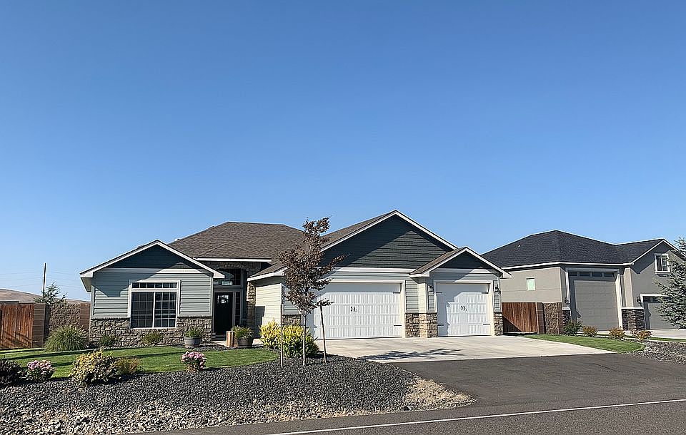 Located in the quiet Summit View neighborhood of West Kennewick, this single-story home with exterior stone accents and custom farmhouse details was built in 2017 and boasts unobstructed views of Badger Mountain from the floor to ceiling windows in the great room. Interior details include Kitchenaid appliances, quartz, farmhouse tile, laminate wood, shiplap ceiling inlay, and wood blinds. The .64 acre lot features a block fence, stone fire pit, large garden, berry bushes, shed, and RV parking.