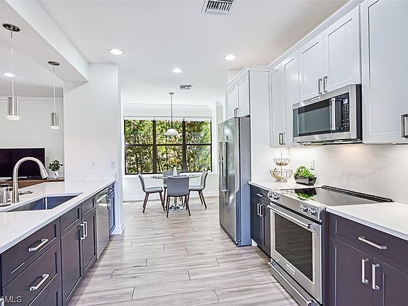 This home has been recently painted inside and out. Front double doors open to the Stunning Grand Foyer-Living room, boasting 20’ cathedral ceilings filled with sun drenched light. New wood-like plank tile flooring throughout the first level. Entertaining in this home is seamless. private outdoor living spaces and screened pool deck flow harmoniously with the interior. Natural stone pool deck, surround the pool and spill over spa. The gourmet kitchen was totally re-done with new 42” wood cabinets, quartz counter-tops and new stainless-steel appliances.
