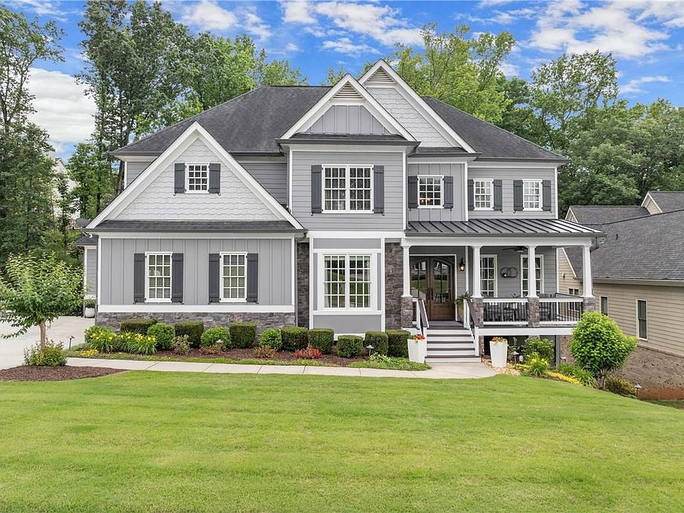 Welcome to your custom built home located in the sought-after River Rock Swim/Tennis Community. This stunning home features Iron double front doors, hardwood flooring throughout home, tiled four season room off the two-story great room, chef's dream kitchen with cabinets and counterspace galore,custom walk in pantry with shelving and full size refrigerator, Butler's pantry/wine/coffee bar, separate dining room, bedroom and full bathroom on the main level and don't miss your deck overlooking your backyard. Walk upstairs where you will find your oversized Primary suite with bath of your dreams. The primary bathroom features custom mirrors with built-in television, garden tub, tiled double sized shower and your walk in closet of dreams-built-in closet system. Two other secondary bedrooms on are the second level-both can easily fit a king size bed. Secondary closets also features closet systems. The finished terrace level includes a full bathroom, bedroom, 12 ft trey ceilings, Kitchenette with sink,refrigerator and kegorator, stunning shiplap wall for television, east in area and walk out to private backyard covered patio. This home also features, 3 car garage, lush landscaping, irrigation system, fire pit in the backyard, AMP landscape lights, built in bench off of the garge entrance, gutter guards, camera system,cul de sac location and more! Enjoy an impressive selection of community amenities, including multiple swimming pools, a playground, a beautiful clubhouse, a cozy fire pit, and courts for both tennis and pickleball. Residents also have access to scenic community areas along the Etowah River. Located within top-rated school zones—Poole’s Mill Elementary, Liberty Middle, and North Forsyth High—this home offers everything you need for exceptional family living. Don't miss this home- true pride of ownership.