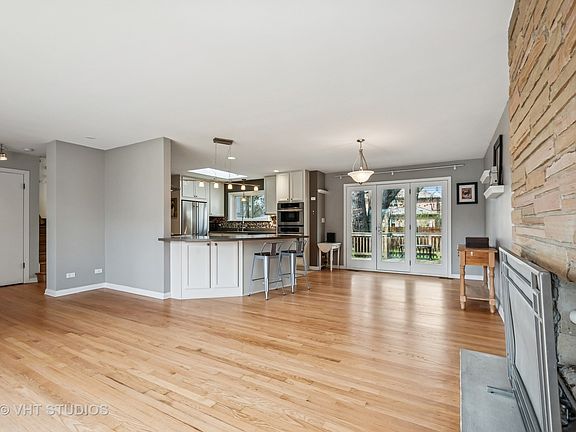 Wonderful flexible space in this expanded split level with finished basement. Extra large parcel, 83x131, 4 bedrooms, 3 1/2 bathrooms, 2 car attached garage. Enter the foyer to find open living room, dining and white kitchen with large skylight, creative lighting, fun mosaic tile splash and peninsula seating; crab orchard stone fireplace. Glass door access to above ground large deck for summer dining with directly attached gas grill included and pretty views of the extra large fenced yard. Upstairs find three nice-sized bedrooms, 2 baths including ensuite primary with skylit Jacuzzi, custom recycled glass tile in the walk-in shower and double sinks; heated towel bar. Retro hall bath has newer large vanity, mirror and lighting. Step down from the foyer to find a generous landing and access to the 2 car attached garage featuring newly installed, insulated overhead door. Here you will see that the house was seemlessly expanded to add a fully accessible, sun-lit main floor bedroom with bay window, built-ins and a private bath with heated floor, roll-in shower, separate tub and a dedicated entrance if needed, perfect for in-law arrangement or private home office. Full-sized washer and dryer within the hall closet. Step down from this landing to find the large bright rec room/playroom with fireplace, perfect for family room, guest room, art studio, hobbies and crafts, with a 1/2 bath. Tankless water heater serves the addition and the electric panel was totally upgraded in 2008. Hardwood floors have just been refinished in a light tone. 2 zones for HVAC. So many extras are included in this wonderful bright home: 2 Ecobee thermostats for remote climate control, custom window treatments, replacement windows, recently painted, and carpeted areas replaced, a New roof 2020, and New copper water service to the house 2025. Lots to love here! Close to Devonshire Elementary school, pool/park, playground, and community playhouse. Convenient to CTA and I-94 on and off ramps, minutes to downtown Skokie library and attractions, as well as a short distance to Old Orchard shopping and dining, theatres and events. House is in very good condition and sold AS IS condition only. Seller has never used the fireplaces.