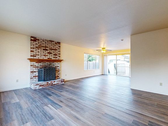 As you enter the property you are greeted by a Large open concepting Living Room/Dining Area with a decorative fireplace and gorgeous Luxury LVT Flooring. The Kitchen offers bar seating and beautiful stone counter tops. The Kitchen also includes appliances such as a Stainless steel dishwasher and an Electric Oven. The Guest Bathroom features tile flooring and a tub/shower combo. All 3 Guest bedrooms have brand new plush carpet flooring. The Primary Bedrooms features new plush carpet flooring, a ceiling fan, AC Unit, and access to the Large Enclosed Backyard which is perfect for entertaining guests. The Primary Bathroom features a dual sink and a private latrine with a walk-in shower. The Home features a Two car garage with washer and dryer hookups as well as a long driveway for additional parking.