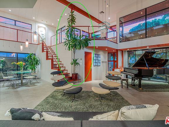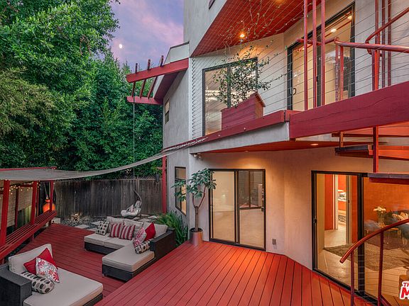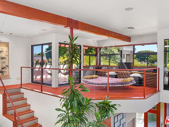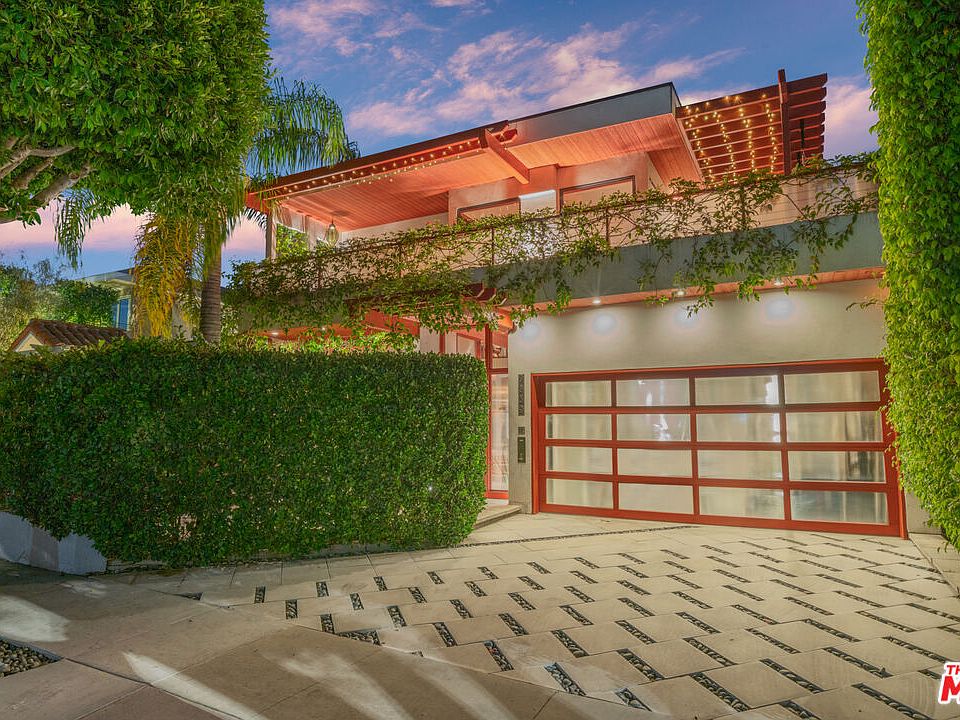 Zen architectural oasis in prime West Hollywood West, featuring an open floor plan with soaring ceilings and an abundance of oversized windows and glass doors that harmonize to create a unique loft-like dwelling with incredible scale and an effortless flow from the interior to the various exterior spaces, including a hedged front courtyard, covered upper level terrace, backyard redwood deck, and rooftop spa overlooking the city. The main level features polished concrete flooring, custom kitchen with SubZero/Gaggeneau/Fisher&Paykel, en-suite guest bedroom, and large den/office. The upper level contains two loft spaces that overlook the main living area, and two bedroom suites, each with deck access to the backyard covered spiral staircase. The primary bedroom features a spa-like bath and large walk-in closet. Off-street parking for four vehicles, including a distinctive driveway and attached two-car garage with large doors in the front and back, providing easy access to the home's side workshop patio and rear yard. Frank Lloyd Wright-inspired design, timeless custom appointments and high-end fixtures can be found throughout this tranquil residence in a highly desirable location surrounded by popular restaurants, shopping, and entertainment.