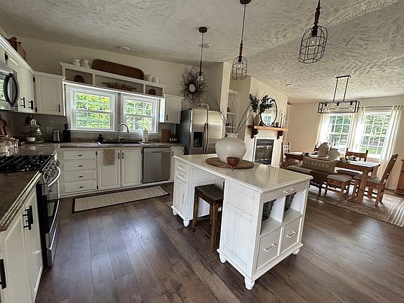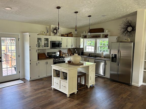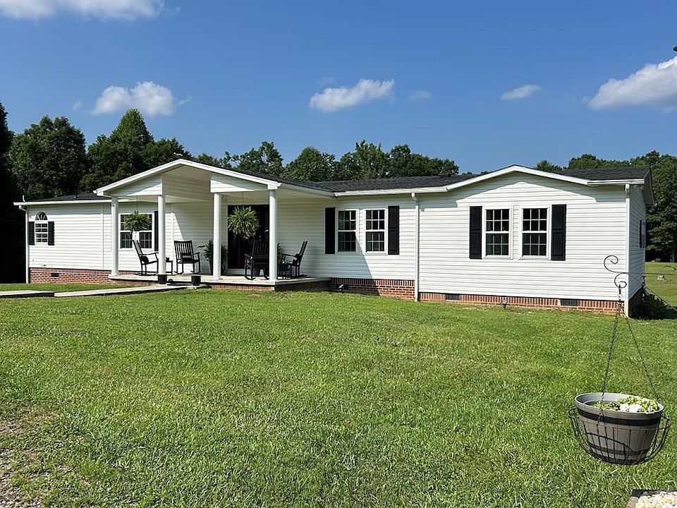 This immaculate 3 bedroom 2 bath home has more to offer that you ever dreamed about. Inside you have a unique floor plan with step down kitchen and dining/den. Home has laminate flooring throughout, newer paint, gas log fireplace and spacious bedrooms. Kitchen boasts a great center island that conveys with the property and plenty of cabinets and counter space along with a pantry. Double doors lead out to a private, open back deck connected to a covered gazebo. Primary bedroom has an ensuite with double sinks and jet tub along with 2 walk in closets with one having a built in shoe rack. Outside you enter the 5.8 acre property via a circular driveway that has brick pillars at each side. You also have a carport, shed, outbuilding and plenty of room to play and hunt. To top this off, you can sit on one of the nicest covered porches ever! Make your appointment today.