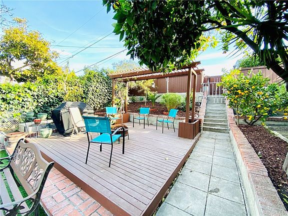 Tucked back on the lot away from the street, this Vista Del Oro family home invites you in with its attractive red front door and spacious well-landscaped front yard. Upon entering the home, the living room features high ceilings with large skylights illuminating the space, which contains a freestanding wood fireplace, guest bathroom and built in bookshelves. Just a few steps away, opens to the spacious dining room just off the recently remodeled kitchen. Kitchen features white wooden cabinets, stainless steel appliances, quartz counter tops and plenty of counter space for meal prepping. Two bright bedrooms are located on the same floor with a full bathroom in the middle. Extra large bonus room is located on the 3rd level through the bedroom and has peak a boo harbor view and can easily be converted into 3rd bedroom or a master suite. The exterior grounds include parking for 3 cars through alley access, underground storage or potential wine cellar, artificial turf yard, fruit trees and detached surf shack workroom with electrical power and additional storage. This house is the perfect family home for those who like to entertain.