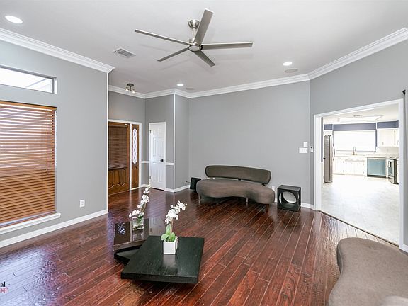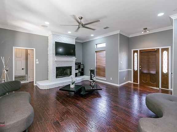 Welcome to this impeccably remodeled home, designed with a sleek and modern gray-and-white palette. The bright, open living room invites you in with its stunning painted brick fireplace and hearth, ready for cozy evenings. Experience superior sound quality with the integrated surround sound system, and enjoy the elegant, wood-like flooring that flows throughout the main areas. The tranquil master suite is your private escape, featuring a luxurious soaking tub, a stylish walk-in shower, and a modern LED mirror. For your convenience, all appliances—including the washer and dryer—will remain with the home. Outdoor living is a dream with the spacious, covered patio and large backyard, both offering plenty of shade for entertaining family and friends. This home is conveniently nestled in the desirable Southern Hills neighborhood, offering the perfect blend of modern comfort and a convenient lifestyle