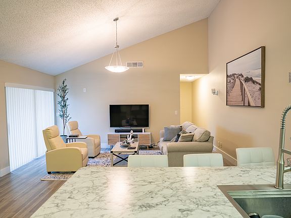 This spacious one-story townhouse offers 1,350 sq ft of living space with vinyl flooring, updated bathrooms. The layout is light and bright with vaulted ceilings and an open-concept feel. Enjoy relaxing or entertaining in the private, fully screened-in courtyard patio facing a quiet greenspace no rear neighbors!