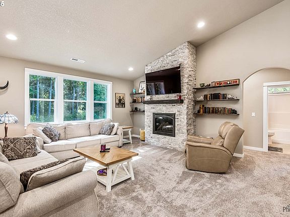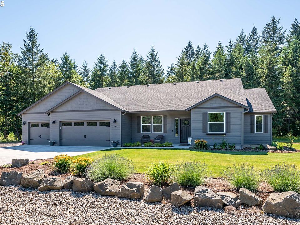 Built in 2019, this stunning one-level home offers the perfect blend of modern comfort and serene country living. Featuring 4 bedrooms plus a dedicated office/den and 3 full bathrooms, the spacious layout provides exceptional functionality and flexibility for any lifestyle. A welcoming entryway with stone accents ushers you into the open-concept great room, where vaulted ceilings, recessed lighting, and a cozy fireplace create an inviting atmosphere. The large kitchen is a chef’s dream—complete with stainless steel appliances, an eating bar, pantry, and abundant cabinetry. The dining area offers a sliding glass door leading to the back patio—perfect for outdoor dining while enjoying peaceful views of deer and local wildlife.The expansive primary suite is privately situated and features a walk-in closet and a luxurious ensuite bath with dual sinks, a soaking tub, and a separate shower. The remaining bedrooms are thoughtfully separated on the opposite side of the home, including a front bedroom ideal for guests with a full bath nearby, and two additional bedrooms that share a Jack-and-Jill-style bath. The front office/den, with its vaulted ceilings and French doors, provides an excellent work-from-home setup or could easily serve as a fifth bedroom.Set on 2 lush, flat, and usable acres, the property includes an oversized 3-car garage, a workshop, and ample patio space for entertaining or relaxation. Located on a quiet cul-de-sac just 10 minutes from Eugene and near Fern Ridge Reservoir, this home offers the best of both worlds—peaceful, rural tranquility with convenient access to city amenities.