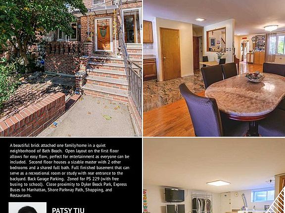 A beautiful brick attached one family home in a quiet neighborhood of Bath Beach. Open layout on the first floor allows for easy flow, perfect for entertainment as everyone can be included. Second floor houses a sizable master with 2 other bedrooms and a shared full bath. Full finished basement that can serve as a recreational room or study with rear entrance to the backyard. Back Garage Parking. Zoned for PS 229 (with free busing to school). Close proximity to Dyker Beack Park, Express Buses to Manhattan, Shore Parkway Path, Shopping, and Restaurants.