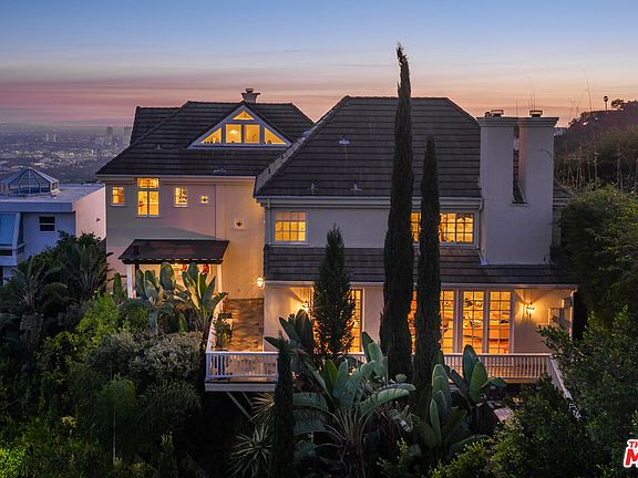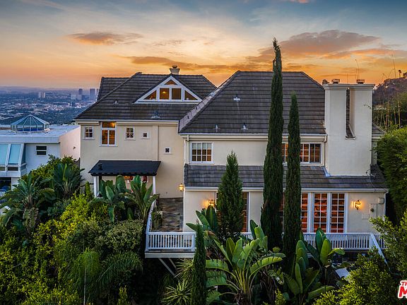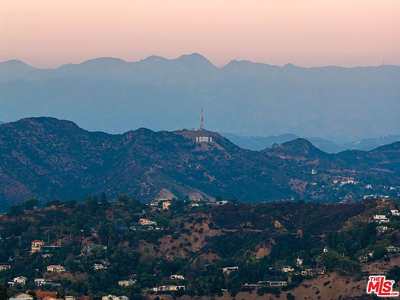 Perched high in the Hollywood Hills West, on a celebrity lined street, this private apx 4,000 sq ft hillside retreat offers modern sophistication with sweeping views of the city, mountains, and the iconic Hollywood sign - just minutes from the flats of West Hollywood, the legendary Sunset Strip, Studio City, and close to everything of interest. A dramatic entry courtyard, complete with Italian Cypress, lavender, and a custom fountain, sets the stage. Inside, soaring 14-foot ceilings and designer details - including Fornasetti and Scalamandre wall-coverings, Ralph Lauren and Jonathan Adler lighting throughout, oak floors, and George Nelson pendants - create a refined yet inviting atmosphere. The open living and dining areas flow seamlessly to expansive terraces designed for entertaining. A chef's kitchen boasts a glass-door Sub-Zero refrigerator, Viking appliances, and generous counter space. Multiple outdoor dining and lounging areas are enhanced by a fireplace, outdoor kitchen, and fruiting lemon trees. Three spacious ensuite bedrooms each feature walk-in closets and stunning views. Dual primary suites offer fireplaces, steam showers, and private balconies, while a separate staircase leads to a third ensuite bedroom and a custom loft. A den/screening room with surround sound and fireplace completes the interior. Outdoors, meandering stone pathways lead to a half basketball court under custom lighting - perfect for recreation or gatherings. A two-car garage, natural light throughout, and layered landscaping enhance this hillside oasis. Located within the award-winning Wonderland School District, this property offers privacy, style, and an entertainer's dream setting in the heart of the Hollywood Hills.