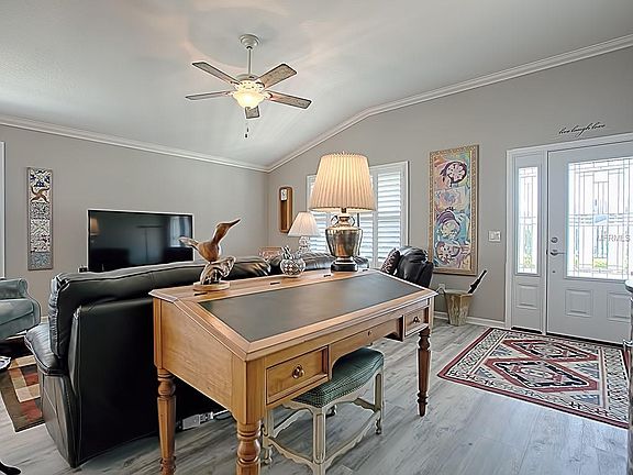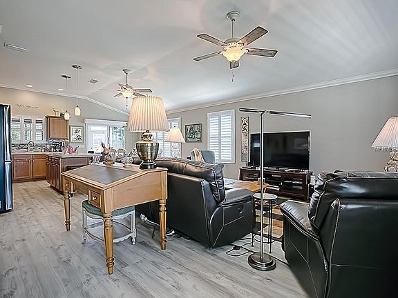 BOND IS PAID on this LIKE NEW, BEAUTIFUL 2/2 PEARL "COTTAGE HOME" w/ popular OPEN floor plan in the Village of SANIBEL! This lovely cottage has very nice curbing, rockery and shrubs and a great front porch! As you enter the home you are greeted with the warmth of this COZY home w/CROWN MOLDING and NEW WHITE-WASHED WIDE PLANK LAMINATE flooring throughout the entire home. From the dining room step outside to your GLASS ENCLOSED lanai with a MOUNTED TV and outdoor patio! The kitchen features "Sable-stained" cabinets w/crown molding, hardware, UNDER /OVER COUNTER lighting, GLASS TILE BACK SPLASH, laminate counters, NEW MICROWAVE, NEW BLACK STAINLESS upgraded 4-door refrigerator and cabinet pantry w/PULL OUTS. Separating the kitchen and dining room is a large ISLAND w/storage & hanging pendant lights. The master bedroom has a large walk-in closet with BUILT INS and pocket door to your en suite bathroom w/dual sinks, separate commode/shower area with NEW FRAMELESS CUSTOM sliding glass shower door and linen closet. The guest room features rain-wash décor color; in the hall is a linen closet & your guest bathroom with tub/shower and the same NEW FRAMELESS SHOWER DOOR. The inside laundry features UPGRADED washer/dryer, set tub & cabinets. Step into your 4' EXPANDED 2-car garage w/storage cabinets, pull-down attic stairs, and electric garage screen. This GEM of a home features NO HOMES BEHIND, PLANTATION SHUTTERS, storm door & NEW FRONT DOOR w/SIDELIGHT gutters all around, architectural shingles and more!