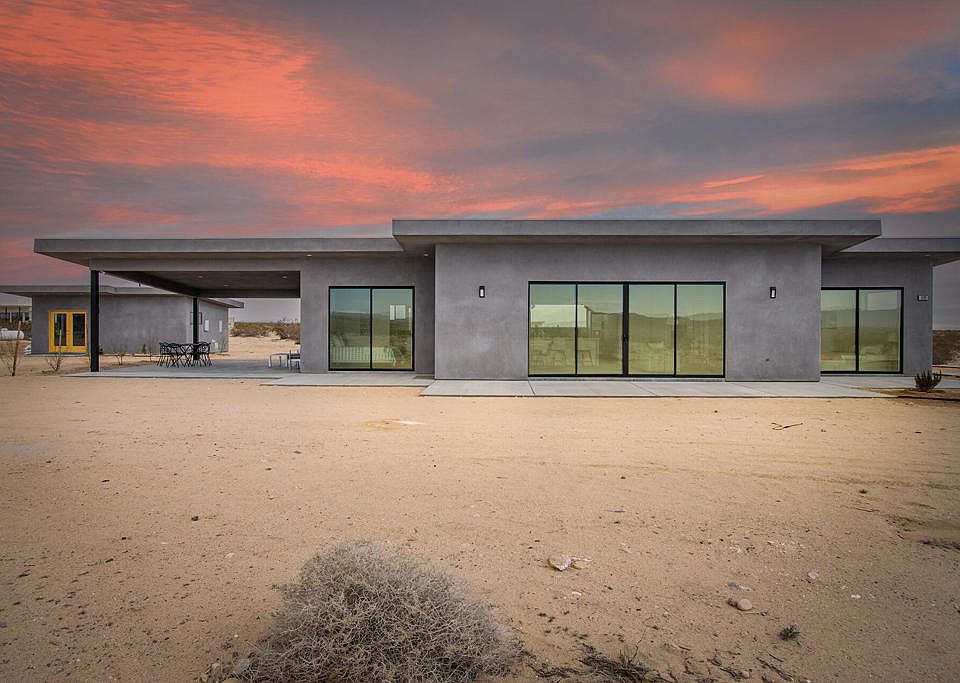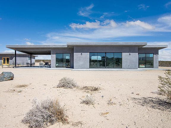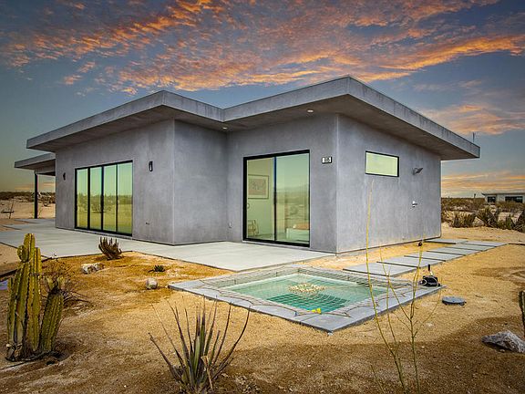 New Construction with Modern Floorplan! Seller may credit qualified buyers loan closing cost and or mortgage rate pay down assistance.Turn-key flat roof modern 1,326 sqft home plus a detached 375 sqft guest house on 1.99 acres. Live in one and rent the other or rent short term on AirBnB. Large windows offer inspiring views with an interior/exterior ambiance. Finished concrete floors throughout. Spacious living room with high ceilings. Linear zero-clearance fireplace with alcove and contemporary craftsman shelving. Expansive dining area with gallery walls. Island kitchen with breakfast bar. Recessed lighting complemented by bell pendant fixtures. New stove, cupboards, counters, sink and refrigerator. New energy efficient AC/heat mini-splits system. Two bright and sizable bedrooms each with glass slider doors to enjoy the stargazing nights. Both bedrooms boast a bathroom with a glass wall shower, new tile, toilets, vanity, counters, cabinets and sinks. Recline on the broad concrete covered patio. Soothing vistas of Mt. San Gorgonio and Mt. Nebo. Detached guest house with double glass doors. Mini split AC/heat. Kitchen with new refrigerator, stove, counters, sink, cupboards and washing machine. Bathroom with new shower, tile, toilet and upgraded vanity plus a hot tub. More celebrities, artists, and musicians are now calling JT home than ever before. Over 30 acres of government land across the street for hiking, dog walking or horseback riding.