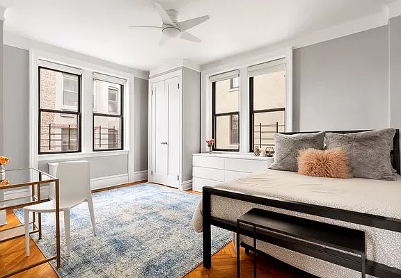 Rare opportunity: bright, renovated 2 bedroom plus office/3rd bedroom, 2 windowed bathrooms, mint move-in condition, high floor, in coveted West End Avenue co-op doorman building, all with low maintenance: 2 large corner bedrooms with two exposures and partial river views. The bonus room currently serves as a bedroom but can serve as a WFH office. This home features an expansive living area with great flow for modern life. The apartment has been lovingly renovated and retains much pre-war detail and prized features such as a decorative fireplace with gorgeous tiles (gas hookup allowed), cast-iron bathtub, high ceilings, large windows and hardwood floors. The renovations include renovated bathrooms, ample storage with eight sizable custom closets and wood cabinetry in all bedrooms, custom bookshelves, new radiators and covers, Modern Fan Company ceiling fans, skim coated crisp walls, custom window treatments and stone window sills throughout. The windowed kitchen is renovated with a smart layout that makes cooking a pleasure and has Silestone countertops, custom wood cabinetry with a pantry, and stainless steel appliances. Apartment 9D conveys with a large (4x6x8) caged basement storage unit and bicycle storage at no additional cost. This appealing home is located on tree-lined West End Avenue a short block from Riverside Park. Designed by preeminent architect, Gatean Ajello, built in 1915, the building is financially solid and well maintained. The co-op is fully staffed with a live-in super, a porter, a handyperson, and a 24-hour lobby attendant. The cherry on the top is the included storage bin, a laundry room, bike room, and a gym with a Pilates reformer and WiFi. All for very low maintenance makes this an exceptional value. Pieds a terres, Co-Purchasing, Gifting & Guarantors are allowed.