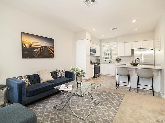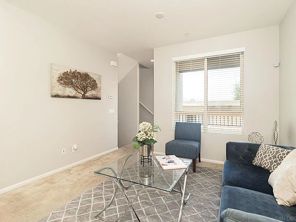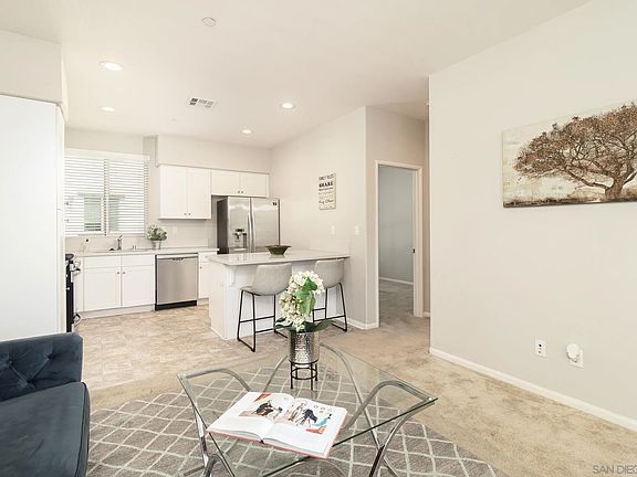 Discover the charm of Montivo in Santee! This chic townhome, built in 2019, blends contemporary living with unbeatable convenience. This home boasts owned solar, 3 spacious bedrooms, and 3 full bathrooms, all within the 1,302 square feet of beautifully designed space. The interiors shine with quartz countertops, stylish shaker cabinets, and a versatile loft area ideal for a home office, media room, or play area. The primary bathroom features dual vanities and dual closets for added luxury. You'll love the oversized attached garage with direct access, providing plenty of room for parking and storage.