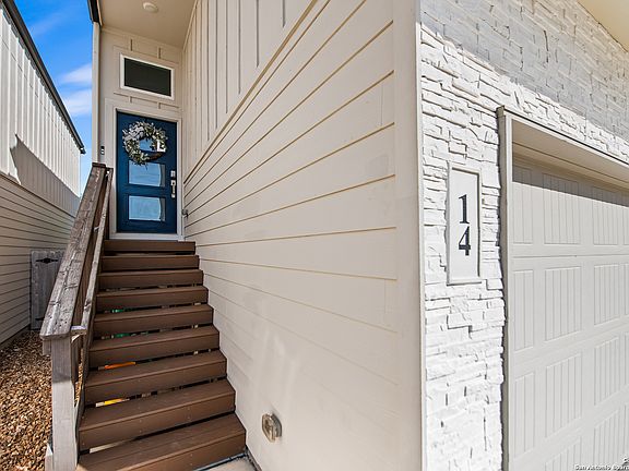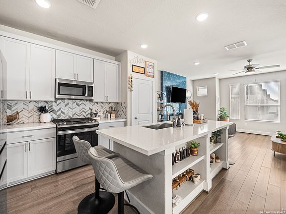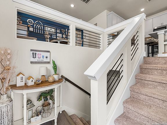 Don't miss this opportunity! Located just minutes from the Medical Center, this beautiful two-story home showcases an open floor plan with modern architectural finishes throughout. Upstairs features the master suite alongside the open-concept kitchen, dining, and living area. Downstairs offers two additional bedrooms with a shared full bath, plus a secondary living/play area that provides great flexibility for families or guests. Recent upgrades include a striking tile veneer on the fireplace and low-maintenance synthetic turf in the backyard. Situated within a desirable gated community, this home combines comfort, convenience, and security in one of San Antonio's most sought-after locations.