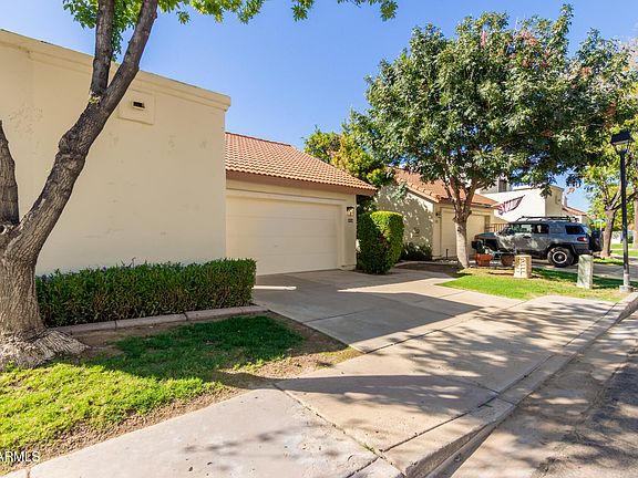 Rare opportunity! 2-Bdrm, 2B, 1 story townhome in the highly desirable Alta Mirada community. Enter into a room bathed in natural light, w/soaring ceiling, & windows looking out into lush landscape, & mature trees. Light oak wood flooring and towering slate tile fireplace lends a warm feeling to this space filled w/good energy. The kitchen w/a plethora of tall cabinetry, rollout shelves, deep drawers, & garages, doubles the storage space in this efficient kitchen; cork flooring, a top choice for chefs', it's easy on legs! 2 bedrooms split, primary w/ensuite bath, WC & huge vanity w/double sinks, French doors lead out to the private flagstone lined patio, 2nd bdrm has a Murphy bed, sitting area, private door to the 2nd patio. Close to all that makes South Tempe the best place to be!