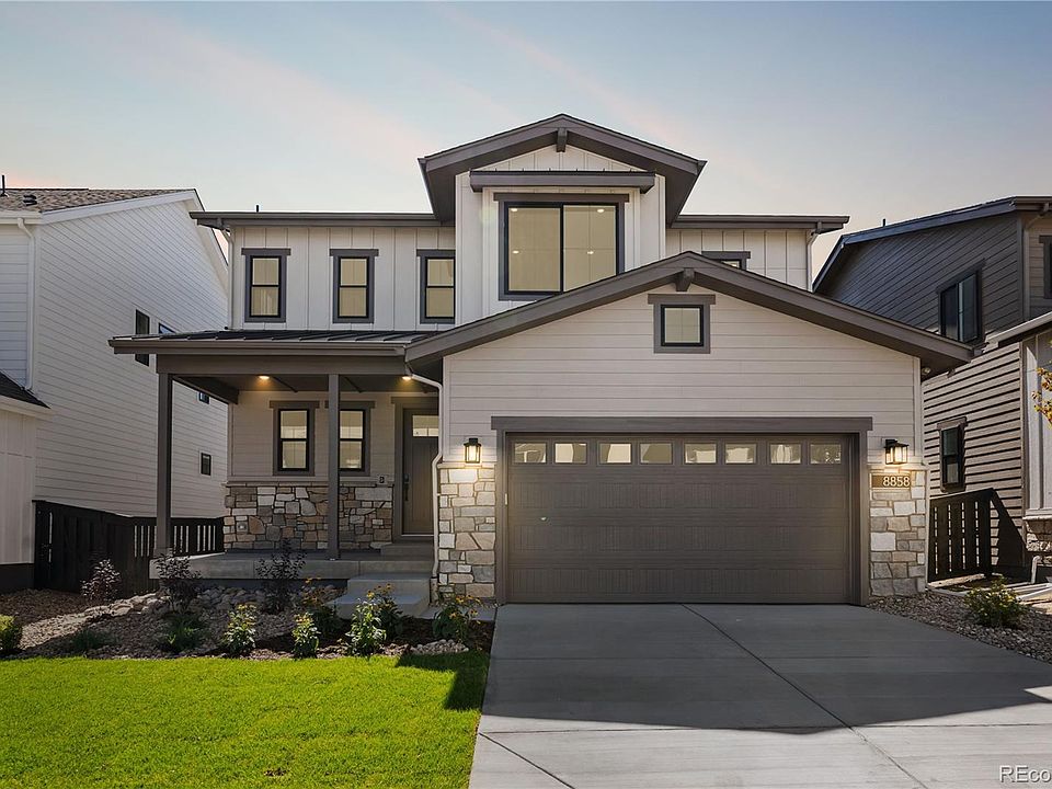 Beautiful two-story home in the desirable Solstice Community. Solstice is surrounded by Chatfield State Park on 3 sides of the community and acreage parcels on the 4th side. This two-story home has 4 bedrooms, 3.5 baths, loft, study with barn door, fireplace with full height tile surround, covered patio, and 2 bay garage. Design finishes include Coretec luxury plank flooring in Miles Oak, AZT/DT engineered stone counter tops in Biano Pearl, and Yorktowne Brockton maple cabinets in Dockside. Please contact a community representative for details. The Mirabelle Metropolitan Districts provide various services to the property and in addition to the estimated taxes, a $40 per month operations fee is imposed.