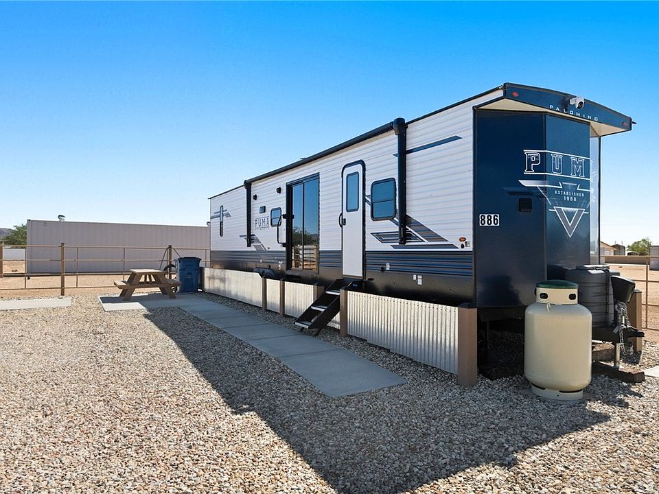 Exceptional Turn-Key Property with Upgraded 2024 Forest River Destination Trailer – Rancho Verde Estates, Golden Valley, AZ. A standout opportunity in Rancho Verde Estates. This meticulously developed 1-acre property shines with a rare combination of comfort, quality, and convenience. Featuring paved roads, metered water service, and a peaceful setting surrounded by mountain views, it is truly a gem in the Golden Valley market. The heart of the property is a beautifully upgraded 2024 Forest River Destination Trailer with 2 bedrooms and 2 baths. Highlights include an electric awning, two slide-outs for expanded living space, a Cool Coat roof, continuous hot water heater, outdoor speakers, and upgraded residential toilets in both bathrooms. This modern Destination trailer is move-in ready for full-time living or a relaxing seasonal getaway. The property has been carefully developed for longevity and versatility, including a 4-bedroom septic system, 200-amp electrical service, and two full RV hookups with a 50-amp connection for guests or additional rigs. Hard-wired Wi-Fi provides reliable internet access for remote work, entertainment, or smart-home needs. Quality fencing, sourced and crafted by Seven Peaks Fence & Barn of Mesa, AZ, surrounds the property with durable steel continuous fencing and a striking heavy-duty red gate. The rear privacy fence constructed of corrugated steel enhances both seclusion and wind protection. The setup also supports livestock, including horses, with water spigots that extend along the fence line towards the back of the parcel. With easy access to the highway while still maintaining privacy, this turn-key desert retreat offers outstanding views in every direction and a lifestyle ready to be enjoyed from day one. A rare find for buyers seeking a complete, thoughtfully designed property in a highly desirable subdivision.