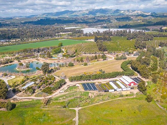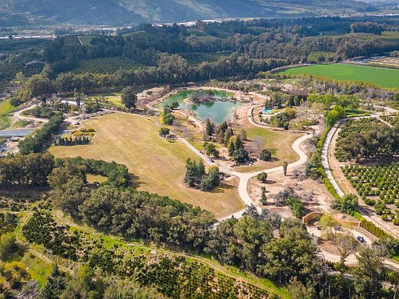 Enter thru a massive beautifully designed metal gate onto a concrete tree-lined drive that leads to a 45.61 acre rural oasis with spectacular vistas, privacy, and seclusion. A true rarity, this Southern California property has a private infinity pool located in the residential garden overlooking a man-made lake of approximately 9 million gallons of water. Trees and plants abound along with waterfowl that drift along to the sound of a waterfall cascading into the lake. In addition, there is a 6,500 sq. ft metal multipurpose barn on the property. The residence provides extraordinary privacy and seclusion with city amenities just 15 minutes away. The surrounding area is comprised of high income properties of lemon, avocado groves, and fields of berries. An extensive electrical and irrigation systems with 440 and 220 power provides for the needs of the Lake and irrigation systems. The lake provides a custom bridge and filter system allowing fish to flourish in approximately nine million gallons of water.Irrigation water is supplied by the Berylwood Irrigation Mutual Water Company. Domestic water is supplied by Ventura County District #1, Southern CA Edison provides electrical power. Propane delivery service available.APN # 5030040215 (195 + 215) = 8860 Stockton Road.If you ever wanted a great investment, here it is.