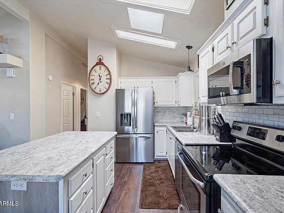 Step into this stunningly remodeled 2-bedroom, 2-bath home in the highly desirable Monte Vista Village Resort! From the moment you enter through the French doors, you'll be welcomed by soaring ceilings, skylights, and celestial windows that flood the space with natural light. The open concept floor plan features beautiful updated laminate flooring, energy-efficient LED lighting, and a bright, contemporary kitchen complete with white cabinetry, granite-look countertops, subway tile backsplash, and newer stainless steel appliances including a refrigerator and microwave.