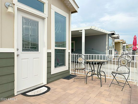 This is a Beautiful 2019 home, turn key ready. Perfect for a couple or Winter Visitor. Wood-like flooring T/O. 1.5 baths gives you plenty of privacy. White cabinets appliances in Kitchen. Plenty of cabinets. Wall of Mirrors in the Bedroom. Walk in shower in Master Bath. Patio in front & back of home. Covered Carport parking. 55+ Community amenities include 24 hr guard gate, Laundry center, several sparkling pools & hot tubs, Tennis, Shuffleboard & Pickleball courts, Lg Clubhouse w/Ballroom, tons of activities to keep you busy, baseball field, billiards room, computer room, fitness center, library, RV storage, putting green, pet friendly, Lot Rent $859.