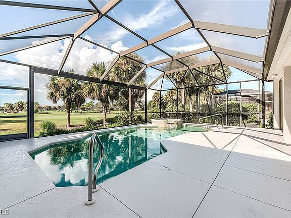 Enjoy a southwest, "Golf Digest" view of the beautiful 5th Green at The Golf Club at Crown Colony through a picture frame screened lanai and pool. This very rare 4 BR Areca model was enlarged by the builder at construction with an added bedroom and bath, making this one of only two 2,359 sq ft, 4/3 models of its type. Fresh paint covers all interior areas and garage for a move-in ready purchase. The new flat tile roof was just installed in December 2024 and the house can be made storm ready quickly with electric roll-down shutters at all the large openings with easy to install clear Lexan shutters at the windows. Newer LVP flooring was installed in the main living areas, the primary bedroom and the 4th bedroom/office. Bedrooms 2 and 3 have new carpeting just installed. The kitchen and all 3 baths have tile flooring. White wood plantation shutters cover interior windows. The water heater was new in 2022, the A/C unit in early 2023, and the pool pump in 2025. The HOA is very well run with low quarterly fees providing all lawn maintenance on a weekly schedule, 24x7 attended gated access, a community pool, hot tub, 4 Har-Tru tennis courts, and well-equipped fitness center open 24x7. Comcast fiber-optic cable and the Xfinity X1 platform with up to 4 TV/DVR boxes, and high-speed Wi-Fi Internet are all part of the dues - over a $750 quarterly value at retail. Social (for Club restaurant access) or golf membership at The Golf Club at Crown Colony is optional. And there is no waitlist for membership! This Club was chosen for the 2022 LPGA $1.5M Drive-On Championship, hosting the world's top women golfers, and is also used for PGA qualifying events.