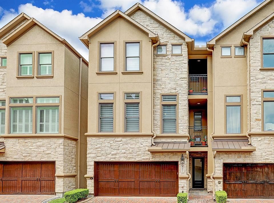 Stunning City Centre Brownstone townhouse ready for immediate move-in! Rare 3/4 bedroom, 3.5 bath recent construction in gate enclave with elevator to all floors. High end finishes throughout. Large gourmet kitchen with Wolf gas range, Asko dishwasher and Subzero refrigerator freezer, wine refrigerator in addition to wine grotto. Gleaming hardwood floors, on the first and second levels with plush carpeting in the bedrooms and stone floors in the bathrooms and utility room. The first level features a large game room with a bedroom, full bath and study or 4th bedroom option that opens with French doors to a large stone patio complete with lush landscaping and a water feature. This level can be closed off as a guest suite or home office. The second level den features a wall of custom built-ins. There are custom Pirouette window shades on the second and third levels with motorized versions in the master suite. Multiple walk-out balconies for lounging. A must see!