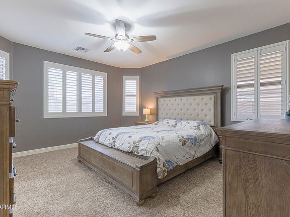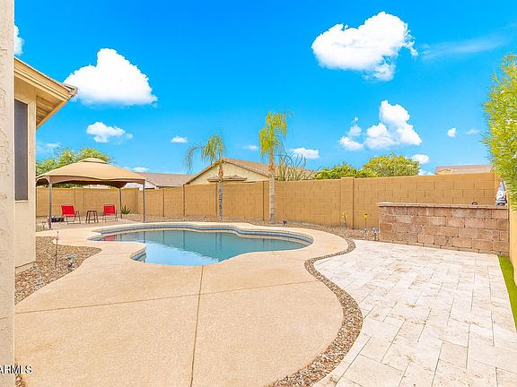 Welcome home! This beautiful single-level residence offers 4 spacious bedrooms, 2 baths, and a 3-car garage. At the front of the home, you'll find a versatile flex space—perfect for an office, game room, library or sitting area. Let your imagination make it your own! The Primary ensuite is thoughtfully split from the other bedrooms for added privacy. Fresh new carpet in all the bedrooms, while tile flooring extends throughout the rest of the home. Elegant plantation shutters add style and energy efficiency throughout. The open-concept floor plan flows effortlessly from the living area to the kitchen, ideal for gatherings and everyday living. Enjoy newer exterior paint for great curb appeal and step outside to your private backyard oasis complete with a sparkling pool, inviting gazebo, and new artificial turf perfect for relaxing or entertaining. Legacy Traditional School and American Leadership Acadamy nearby! Located near local favorites like Schnepf Farms, the Queen Creek Olive Mill, Fat Cats, and Pecan Lake Entertainment, this home combines comfort, style, and convenience. Don't miss your chance to make it yours!