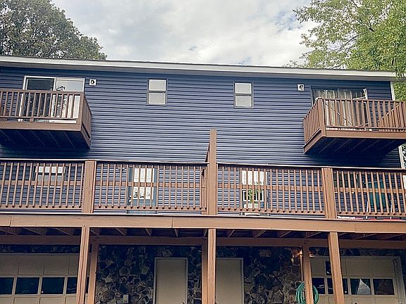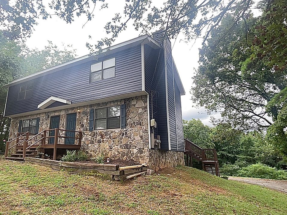 Main level welcomes you into the living room with stone fireplace, sizeable kitchen that opens up to a large deck, and 1/2 bath. Upper level has 2 bedrooms and a full bath and the master bedroom provides a balcony, with great view of private back yard!