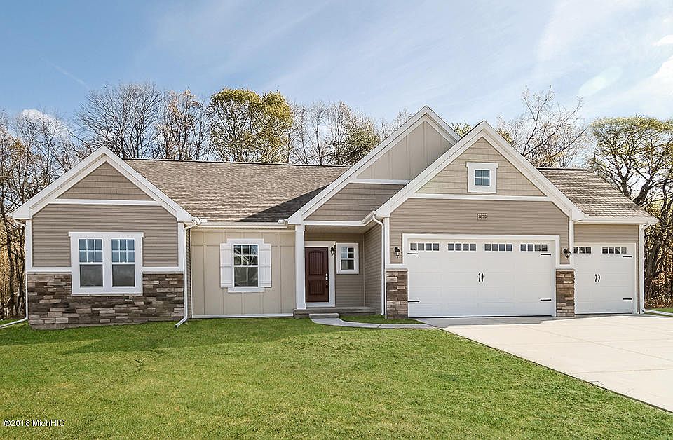 New construction complete! Stonegate is located in highly desirable Byron Center School District and sits on 17 acres of preserve, offering privacy and backdrop for suburban living. Mature trees line the streets of the community, while outdoor parks are a few minutes away. RESNET ENERGY SMART NEW CONSTRUCTION, 10 YEAR STRUCTURAL WARRANTY. This beautiful ranch home offers great living choices! The open and spacious floor plan offers a convenient mudroom with built in cubby/bench, first floor laundry, open kitchen, ample pantry space and more. Vaulted ceilings in large great room and gorgeous kitchen. Kitchen features castled cabinets, center island, granite counters, tile backsplash and stainless steel; dishwasher, range and microhood, finished with a dining nook. Enjoy a large master suite with walk-in closet and private master bath. 2 more spacious bedrooms and another full bath finish this ranch home with style and convenience. Hydro/drill seed, irrigation and landscape included.