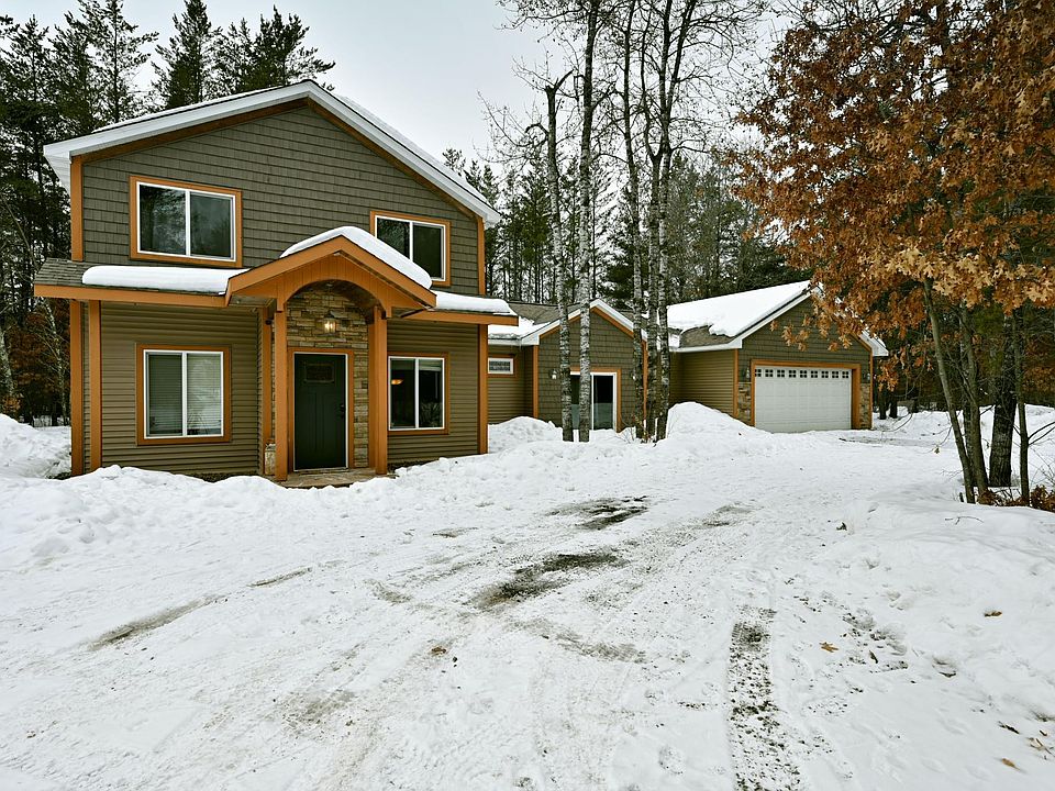This impressive architectural designed 1.5 story home, on 10 acres, boasts many modern elements such as the open floor concept, all living facilities on one level, clean lines with geometric shapes, neutral color palette, with natural light celebrated throughout. Several trend setting updates feature natural wood, luxury vinyl plank flooring, ceramic tile and metallic epoxy (non-Slip) upper level flooring. The floor plan features an alley style kitchen with breakfast bar, generous living area, spacious 3+ Bedrooms, (main level master w/walk-in closet), office/den or pantry room, second level family area with walk-out balcony(potential), two gorgeous bathrooms and attached 26 x 24 garage w/service door. The ten wooded acres comprises two adjoining parcels, with location only 90 mns from the twin cities, and minutes from Webster or Siren, WI.(Some furniture included)