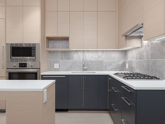 Laminate wood flooringOver-height ceilingsFloor-to-ceiling windowsContemporary kitchenDurable quartz countertopsTwo-toned cabinetryPremium bosch integrated appliances