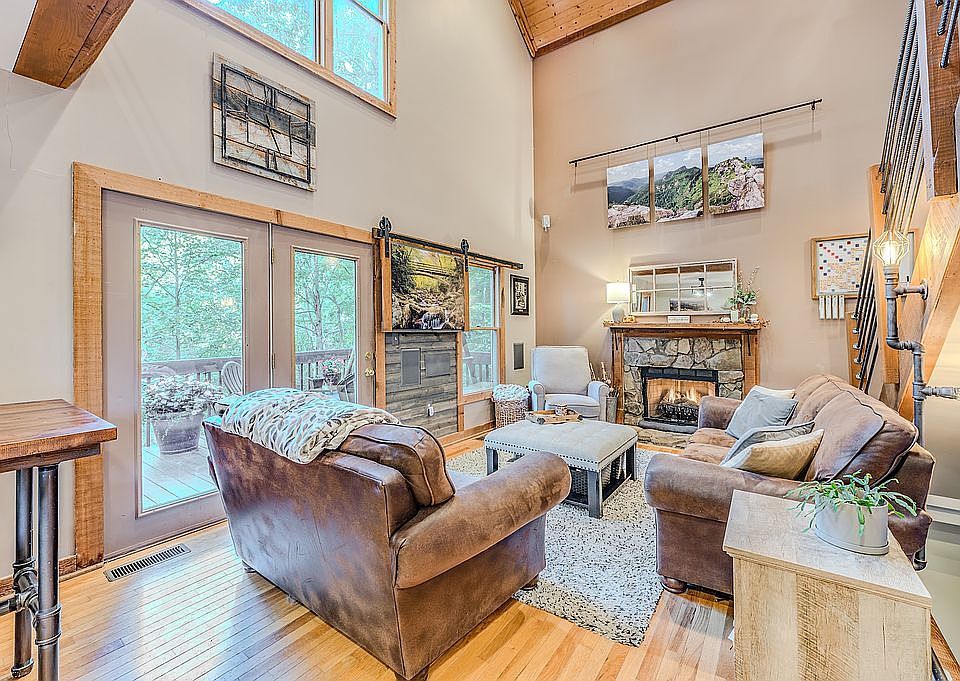 Nestled in the woods just a few minutes from town, you can walk from the park-like setting of this beautiful home to the banks of the New River. Incredible living room features soaring 30 foot cathedral ceilings, many large windows and stone fireplace with gas logs. Main floor bedroom and bath for one level living. Quartz countertop and stainless steel appliances in kitchen. Ascend the open staircase to the master suite with large loft, and an additional third story loft with open view to the main living area. Downstairs boasts a cozy Mother-in-Law apartment, den, kitchen, full bath and a large covered deck with access to a dog lot with a wooden fence. This space has a separate entry and has been rented for additional income. Need storage? In addition to many large closets throughout the house, there is a large custom built outbuilding. Each floor has it's own full bath. Tankless hot water heater. This is a very nice home with wood flooring and solid wood doors and trim, upscale kitchen and dramatic windows with privacy galore.