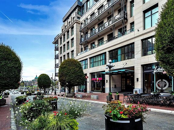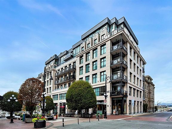 Welcome to Customs House — one of Victoria’s most iconic and luxurious residences. This elegant 2 bed, 2 bath home offers 1,132 sq. ft. of refined living with soaring 10’ ceilings and wood wide plank floors. The spacious great room is filled with natural light from oversized windows, while the Italian-designed kitchen impresses with integrated Bosch appliances, quartz countertops, a gas range, wine fridge, and built-in espresso machine. A bright office off the living room enjoys a views of the Inner Harbour — ideal for work or relaxation. The primary suite includes a walk-in closet and a 5-piece ensuite with heated floors and double vanity. The second bedroom sits beside the main bath for added privacy. Enjoy relaxing on the West exposed and water view balcony. Customs House offers exceptional building amenities: a state-of-the-art gym with yoga room, sauna, and steam room, plus concierge service, car wash station, and secure parking. Pets and rentals permitted