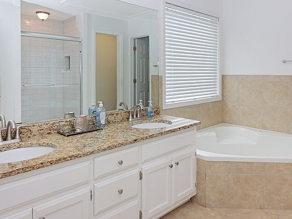 The main-level primary suite is a true retreat, featuring a luxurious bathroom with granite countertops, a Jacuzzi tub, custom-tiled shower with brick subway tiles, and an expansive walk-in closet complete with an organization system.