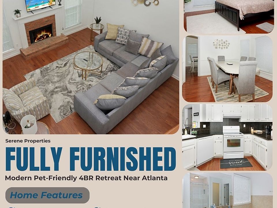 The kitchen boasts modern amenities, including sleek granite countertops and a bright breakfast nook with large windows showcasing scenic backyard views.