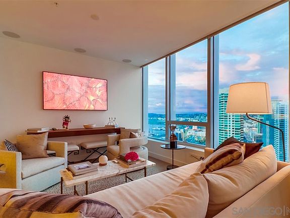Elevate your lifestyle at this ultimate luxury condominium with unforgettable views from every room. Live above it all in downtown San Diego overlooking the city through picturesque, ceiling-high windows and a large private terrace providing uninterrupted views of the city and bay. Treat yourself to comfortable rooms that showcase your lifestyle in a sleek and modern yet refined way. Available Furnished. Continued below in supplement.... The relaxing living room, dining area, and kitchen comfortably flow in an open floorplan for a relaxing feel, making it perfect for casual yet elegant entertaining. Soft and warm neutrals, wood-style floors, and recessed lighting accent each room. Delight your senses even further with the built-in sound system. The fully-equipped kitchen has generous space that accommodates your needs and features a large breakfast bar for style and functionality. The two sophisticated bedrooms feature spacious spa-like stone and tile bathrooms with the master suite having a walk-in closet. Unparalleled amenities include chef concierge, a business center, a fleet of high-end vehicles, pool with cabanas, dry sauna, steam room, movie theater room, and a fifty-foot yacht for your enjoyment. Add an extra dose of luxury to your life and come see what possibilities Pacific Gate, California's first Super Prime building has to offer you.