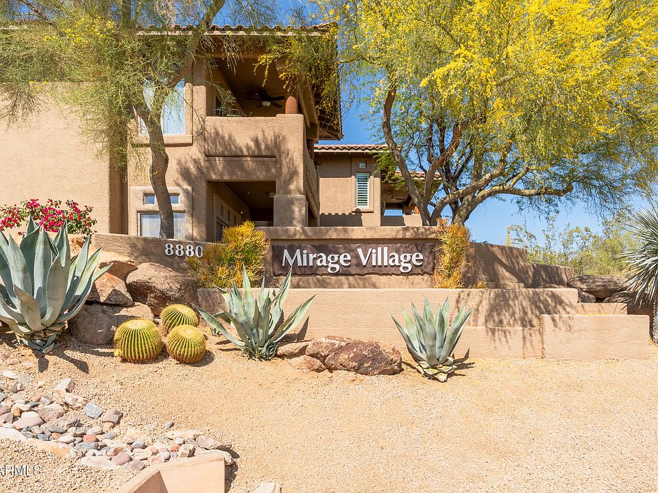 NO STAIRS at this Mirage Village condo and just steps from the resort-style pool, spa, fire pit and BBQs. The updated kitchen, with its inviting breakfast bar, flows seamlessly into a spacious great room, perfect for entertaining. Step onto your private patio and immerse yourself in breathtaking, unobstructed desert views. This year's addition of a modern entertainment wall elevates the great room, creating an ideal space for gatherings. With two master suites and a space for your home office, a detached garage, and proximity to dining, shopping, and hiking trails, this residence offers Scottsdale living at its finest.