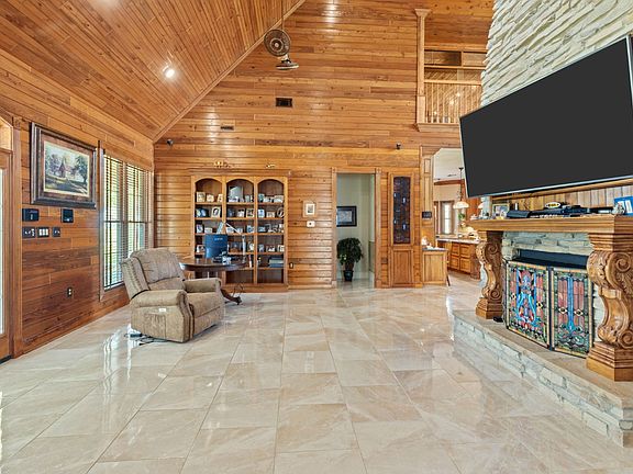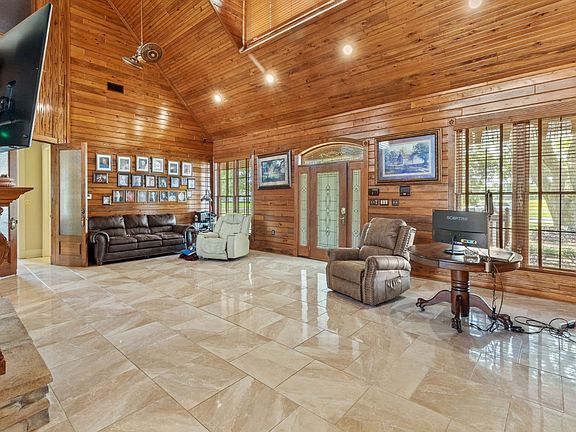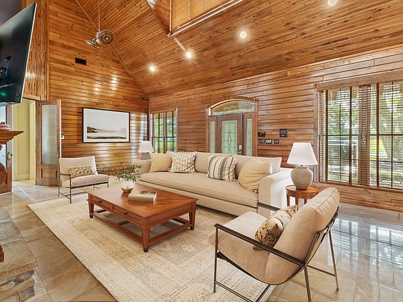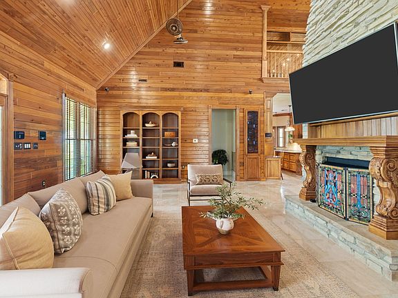 Discover timeless Southern charm fused with thoughtful craftsmanship in this spacious 4-bedroom, 4.5-bath estate nestled on 3 serene acres. Framed by graceful, century-old oaks and a welcoming front porch, this home invites you into a life of peace, space, and possibility. Built to last, the home sits on a robust foundation supported by eighty 10-foot shafts beneath the slab, ensuring unmatched stability and peace of mind. The front elevation is graced with solid concrete columns, adding to the home's enduring beauty and strength. Step inside to find a warm, inviting interior with 30 ceilings in the living area with old growth cypress as the finish on ceiling and walls.These natural wood accents pair beautifully with abundant light. The main living room features a show-stopping stone fireplace, perfect for cozy evenings and gatherings. An adjacent dedicated office offers flexibility - ideal as a work-from-home space, fifth bedroom, or nursery. Along with a huge adjacent pantry for cook of the day; the gourmet kitchen boasts rich wood cabinetry, granite countertops, a large center island, and beautiful custom lighting. This dreamy kitchen seamlessly connects to the dining area and spacious great room which are further joined by a grand double sided fireplace. The exquisite master bedroom is suited with an en-suite bath and stunning fireplace for intimate cozy evenings. The additional three bedrooms are also well suited and include en-suite baths, providing comfort and privacy for all. Out back, a screened-in patio with a built-in stone cooking area creates a natural extension of the home - ideal for hosting or unwinding while overlooking your acreage. The barn and pond add rustic appeal and offer endless potential for gardening, animals, or simply enjoying the outdoors. And if you cant be outdoors, the quiet library space at the upstairs landing provides the perfect spot to relax and enjoy the view over the expanse of acreage beyond. The additional luxuries such as wired security system and intercom system throughout, 100 gun display cabinet, zoned air conditioning for individual comfort, dual air conditioning systems to efficiently manage environmental comfort, dual tankless hot water systems to provide endless hot water wherever you are in the home and an oversized 3 car garage for your vehicles and toys make more than a home - it's a lifestyle of space, intention, and quiet luxury. Schedule your private showing today and come experience all the thoughtful touches that make this property truly one of a kind. Some photos contain digital furniture placement