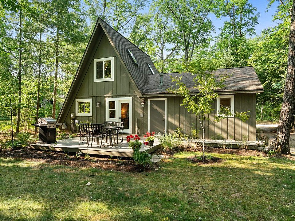 Nestled between two tranquil lakes rests a peaceful A-frame surrounded by forest and gardens. This home gives you everything being "up-north" has to offer. The interior was constructed by two master woodworkers. Listen to the birds sing with the morning sun and the tranquil silence of the forest at dusk. Just 1 mile from Interlochen Arts Academy, less than 1 mile from both Duck Lake and Green Lake access, 20 mins from downtown TC & only 30 mins to Sleeping Bear Sand Dunes. Property is currently operating as a short-term rental and subsequently tenant occupied. Due to the STR nature of the property, all showings must take place by appointment with 24 hour notice.