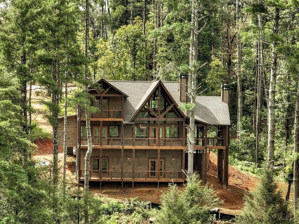 "NEW" LODGE STYLE Modern Rustic Home with Year Round MOUNTAIN & RIVER VIEWS! Move-In Ready, this 4BR/3.5BA is perfectly situated on 3.47 acres. You can see & hear the river from the 3 levels of porches. Be prepared to be WOWED w/massive post & beam covered porches & a party porch w/outdoor fireplace. Open concept floor plan with soaring cathedral ceiling, beautiful wall of windows & stone fireplace. Well appointed kitchen includes real stone backsplash, an island with 3" custom countertop, handcrafted cabinets & an area for dining. Primary suite has a spa like bath w/stone accent wall & lg walk-in closet. Half bath & laundry are also on main floor. Upper level has a huge LOFT, 2 BR, private porch & full bath. Terrace level includes a huge family/rec room, bedroom & bath. (No HOA fees & STR's are allowed.) Located 6.5 miles from town, all paved rds, super easy access!