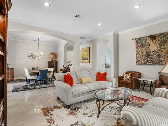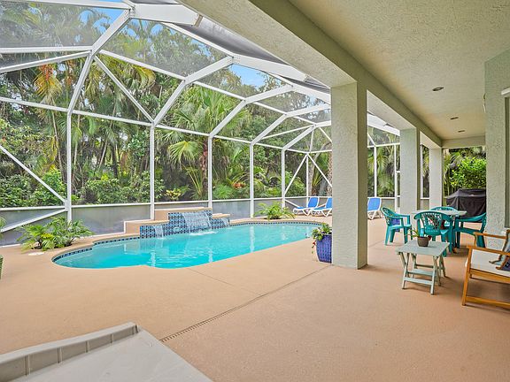Welcome home to your dream tropical oasis. This beautifully updated home offers 4 bedrooms, 3 full bathrooms and a screened in pool with lush landscaping and privacy behind. Island club offers both private deeded beach access and river access in the community with a day dock. Many upgrades throughout including upgraded glass front doors, new AC, smart home appliances, upgraded tile flooring, designer lighting and fans, plantation shutters, custom closet built ins. The garage offers customized storage and the pool has new equipment. Crown molding and volume ceilings throughout the home. Two spacious guest bedrooms share a jack and jill bathroom. Primary bedroom has sliders out to the pool deck and a large walk in closet. Primary bathroom features double sinks, a walk in shower and separate tub. Remodeled kitchen features white cabinetry, double ovens, upgraded appliances, double sinks and plenty of counter space. Seating area for barstools and a breakfast nook overlooking the pool deck. Formal living and dining rooms near the entry of the home feature beautiful archways, high ceilings and crown molding. Tinted sliding glass doors lead out to the screened in pool deck, with plenty of room for lounge seating, a dining area and more. Lush landscaping surrounds the property offering a truly private experience. Just a 15 minute walk to the Island Club's private beach access. Community features a day dock with river access, clubroom, tennis court and fitness center. Call today for a private showing.