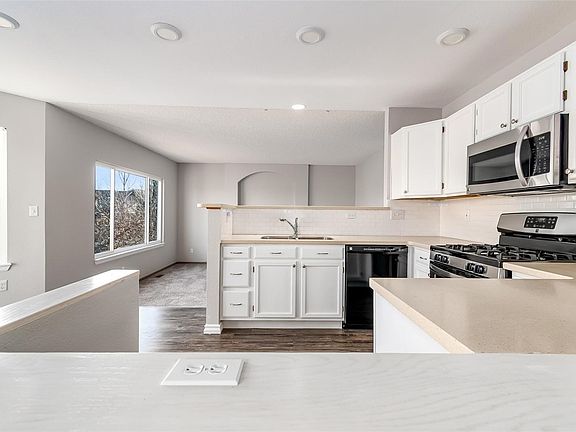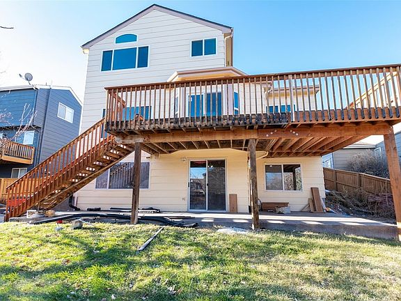This Highlands Ranch two-story home offers a fireplace, an office, vaulted ceilings, stainless steel kitchen appliances, quartz kitchen countertops, a master bath separate tub and shower, a master bedroom walk-in closet, a deck, and a three-car garage.