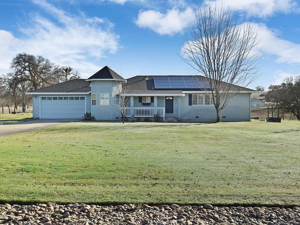 Nestled in the serene landscape of Valley Springs,close to Burson. This 3/2 and 5(usable)acre property presents a charming blend of comfort and countryside living. It offers a picturesque retreat from the bustle of city life. School bus comes right up the street (a couple homes away) for pick up. The interior has been very well maintained and features a spacious living room with vaulted ceilings, modern kitchen appliances, 50 yr comp roof put on in 2004, plantation shutters on front & side of home, whole house fan to help in the hot days. The Bose surround system lends for music ann entertaining. Stepping outside to a large covered patio with hot tub in an enclosed metal gazebo, and your own 5 usable acres with a seasonal pond & spring running through for endless possibilities. Whether it's hosting gatherings,cultivating a thriving garden, have cows or horses or simply enjoying the tranquility of nature, the outdoor space provides a canvas for various activities. Property is partially fenced. The Dog Kennell, tractor w/disk & 8'x 45' Sea/land container for aditional storage come with the property. Enjoy the convenience of suburban living without sacrificing the peace and privacy afforded by this rural setting.