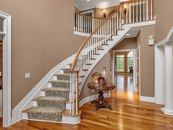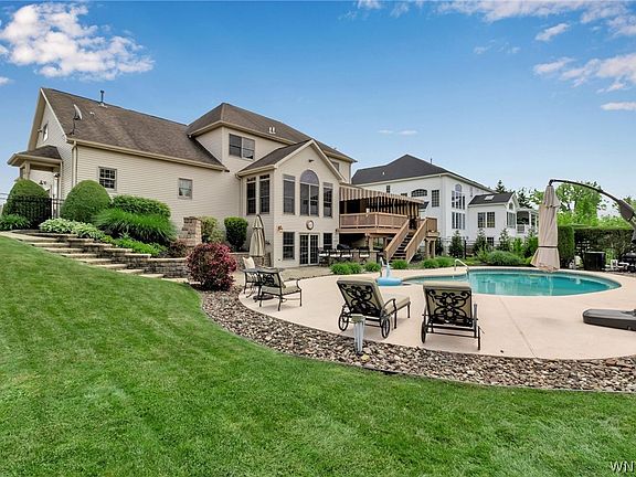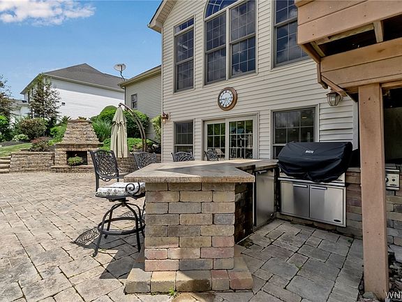 Stunning and well maintained Natale built luxury living in quiet Clarence neighborhood featuring a two-story foyer, large bright eat in gourmet kitchen with morning room and walk out to covered deck overlooking private yard, walk in pantry, formal dining room, large coffered ceiling family room with gas fireplace, gorgeous office/den with built in bookcase and desk. Second floor features four spacious bedrooms, primary bedroom with en suite full bath and heated floors, three walk in California closets, one of the three closets can be used as additional office/den space. Fully finished walk out basement with full bath, cedar closet and ample storage space. Private outdoor oasis features a large patio, wood burning fireplace, in ground salt water gunite spa pool, outdoor kitchen with bar table, gas grill and fridge. 3,5 car sideload garage, security system, Cummins generator, newer furnaces, hot water tanks and pool heater. Close to miles long bike path and central to shopping. The list goes on, this home has it all and is an entertainer's dream!! Tax record sqf does not include additional space and third bathroom in basement.