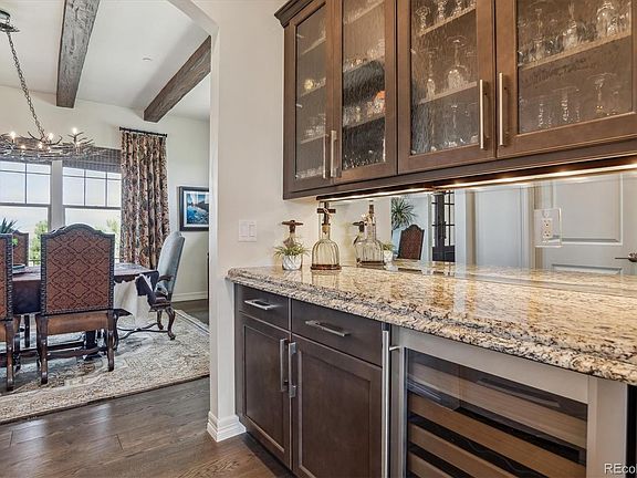 Custom wood beams, window treatments framing views of the front range, and a butler's pantry in the dining room make an impression as you step inside this designer home. The kitchen features stainless steel GE Monogram appliances, granite countertops, subway tile backsplash, well-appointed lighting, and a spacious pantry. Custom built-in entertainment centers framing the gas fireplace, wide plank flooring, tray ceilings, high-end light fixtures and views from every window are special touches that effortlessly combine elegance and comfort in this open concept floor plan.